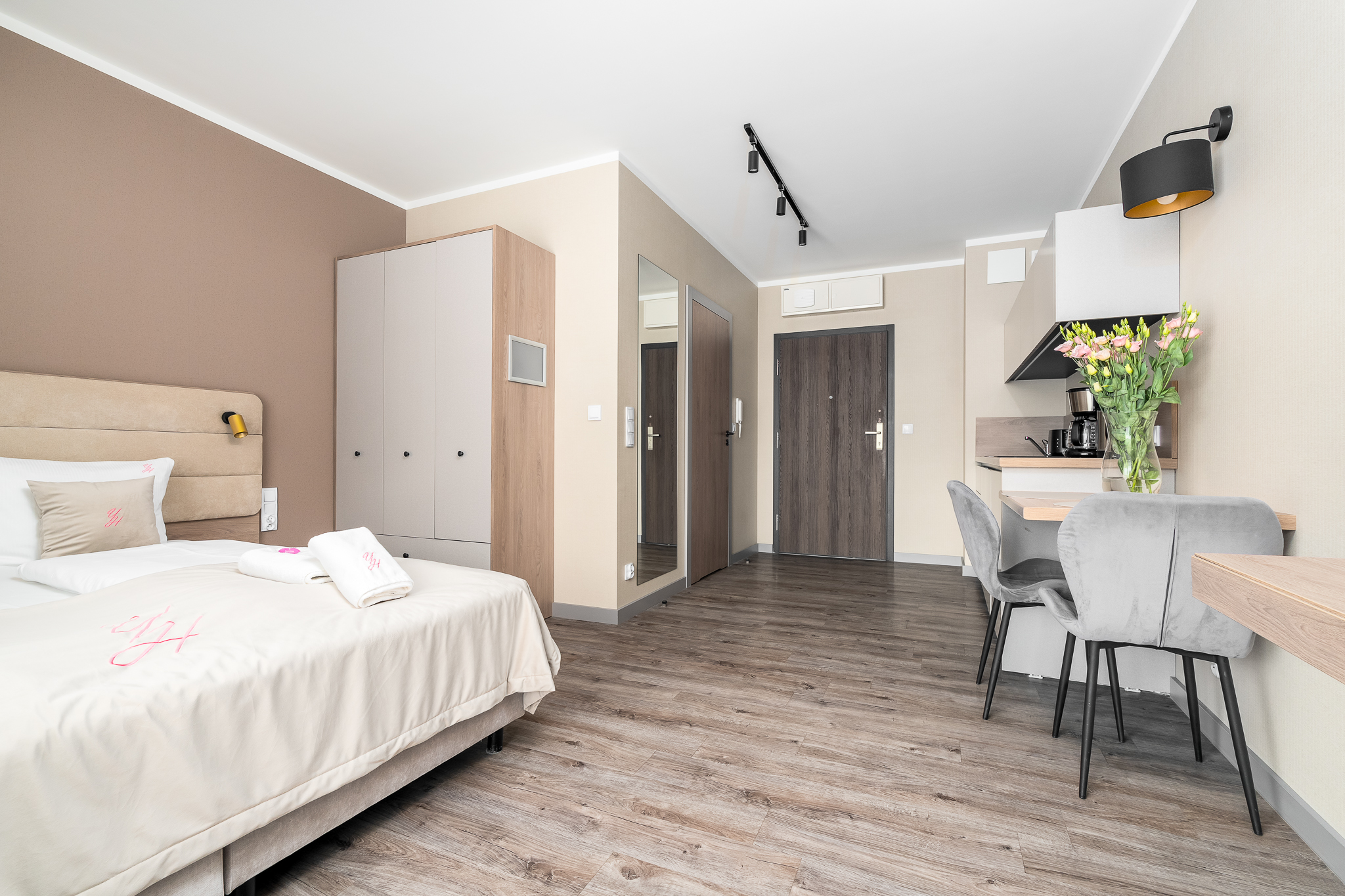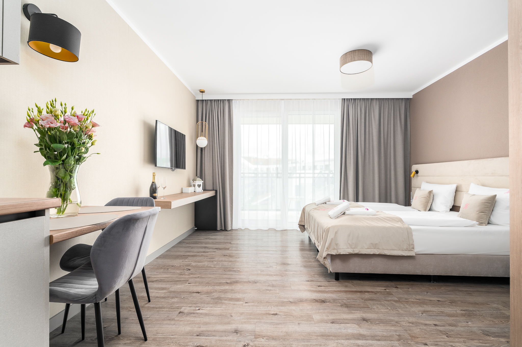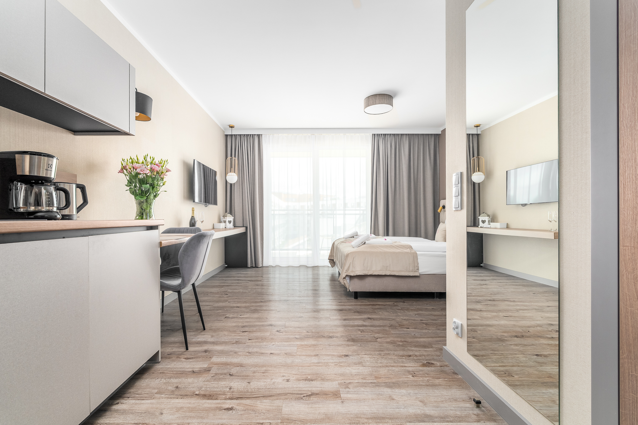 Apartament składa się z przestronnego salonu, w którym znajduje się wygodna rozkładane łóżko 160×200- idealne do odpoczynku i relaksu po dniu pełnym atrakcji. Salon jest połączony z nowoczesnym aneksem kuchennym, wyposażonym we wszystkie niezbędne sprzęty, co umożliwia przygotowanie własnych posiłków w miłej atmosferze. Apartament posiada balkon.