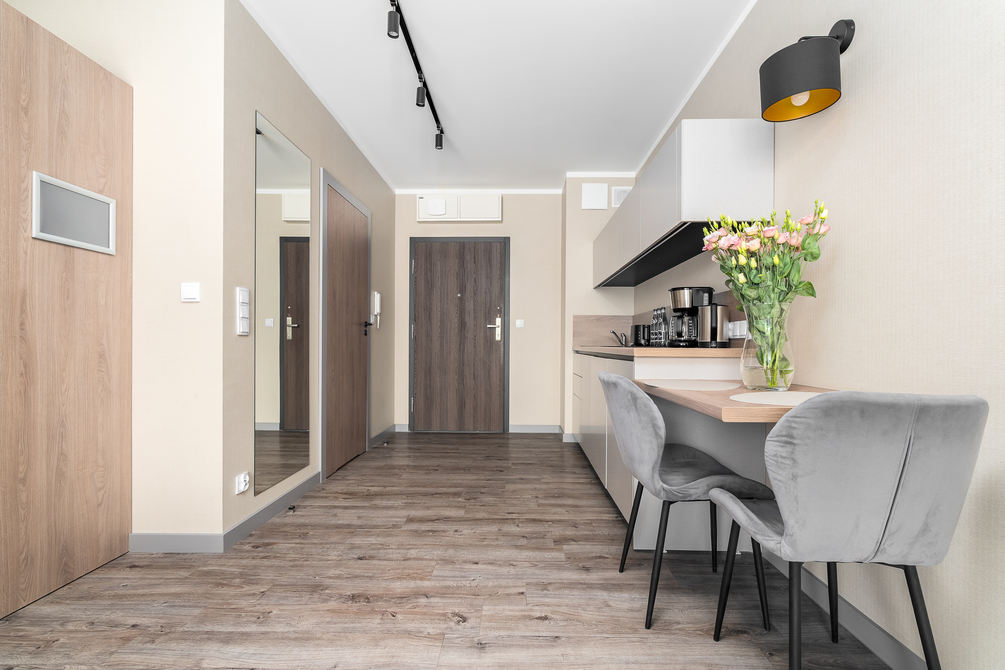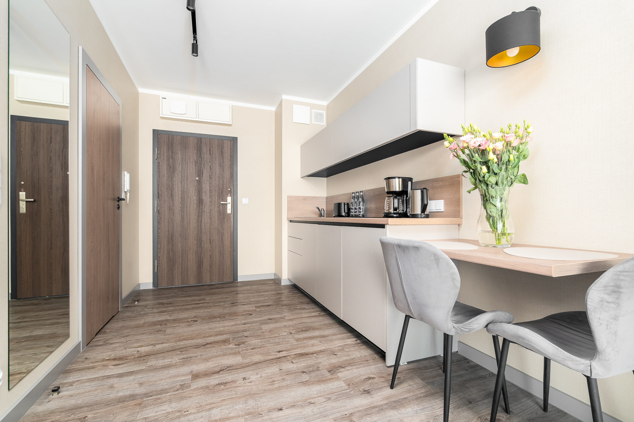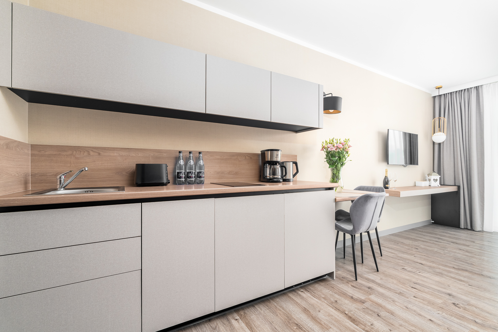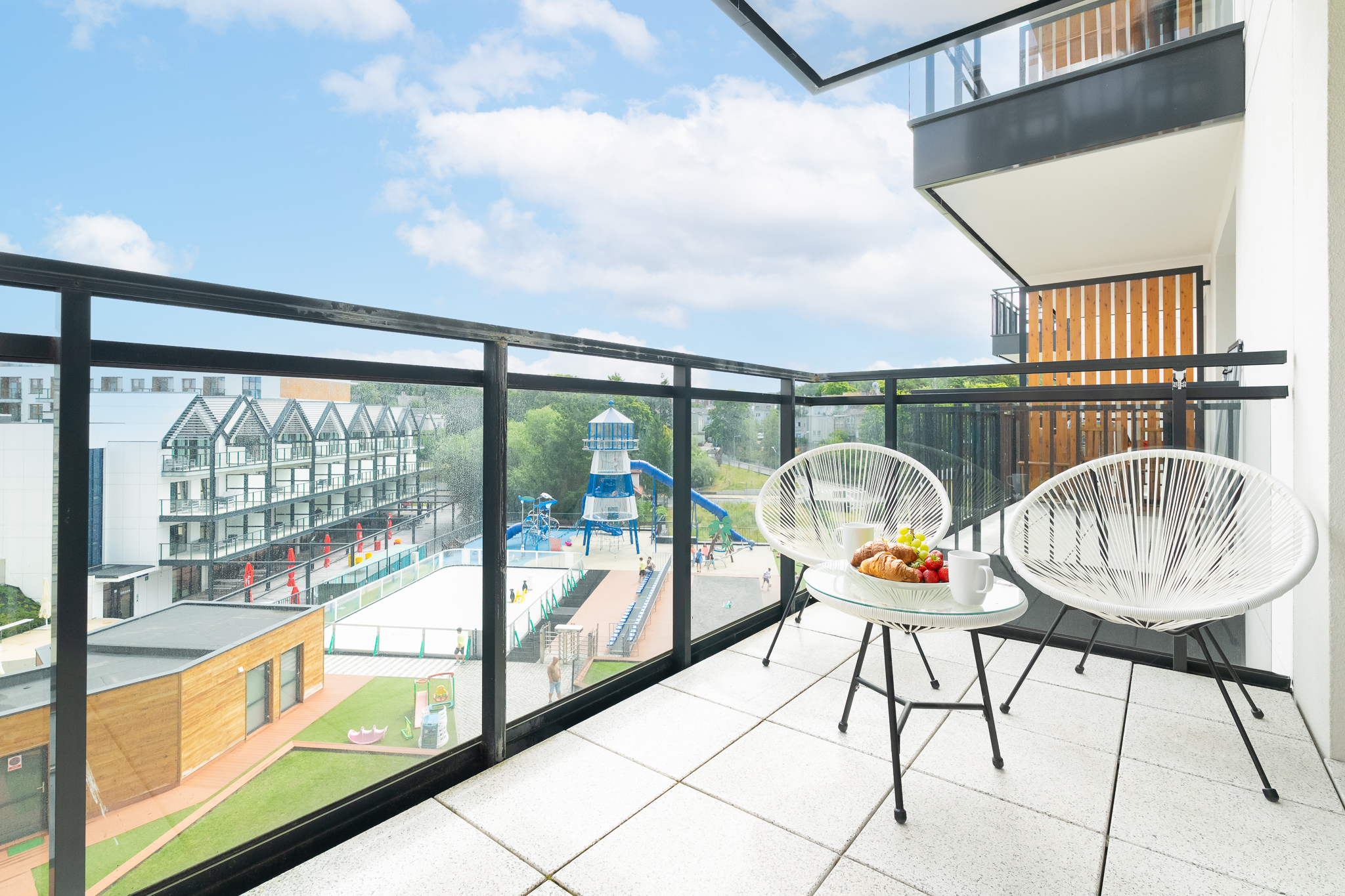 Apartament składa się z przestronnego salonu, w którym znajduje się wygodna rozkładane łóżko 160×200- idealne do odpoczynku i relaksu po dniu pełnym atrakcji. Salon jest połączony z nowoczesnym aneksem kuchennym, wyposażonym we wszystkie niezbędne sprzęty, co umożliwia przygotowanie własnych posiłków w miłej atmosferze. Apartament posiada balkon.