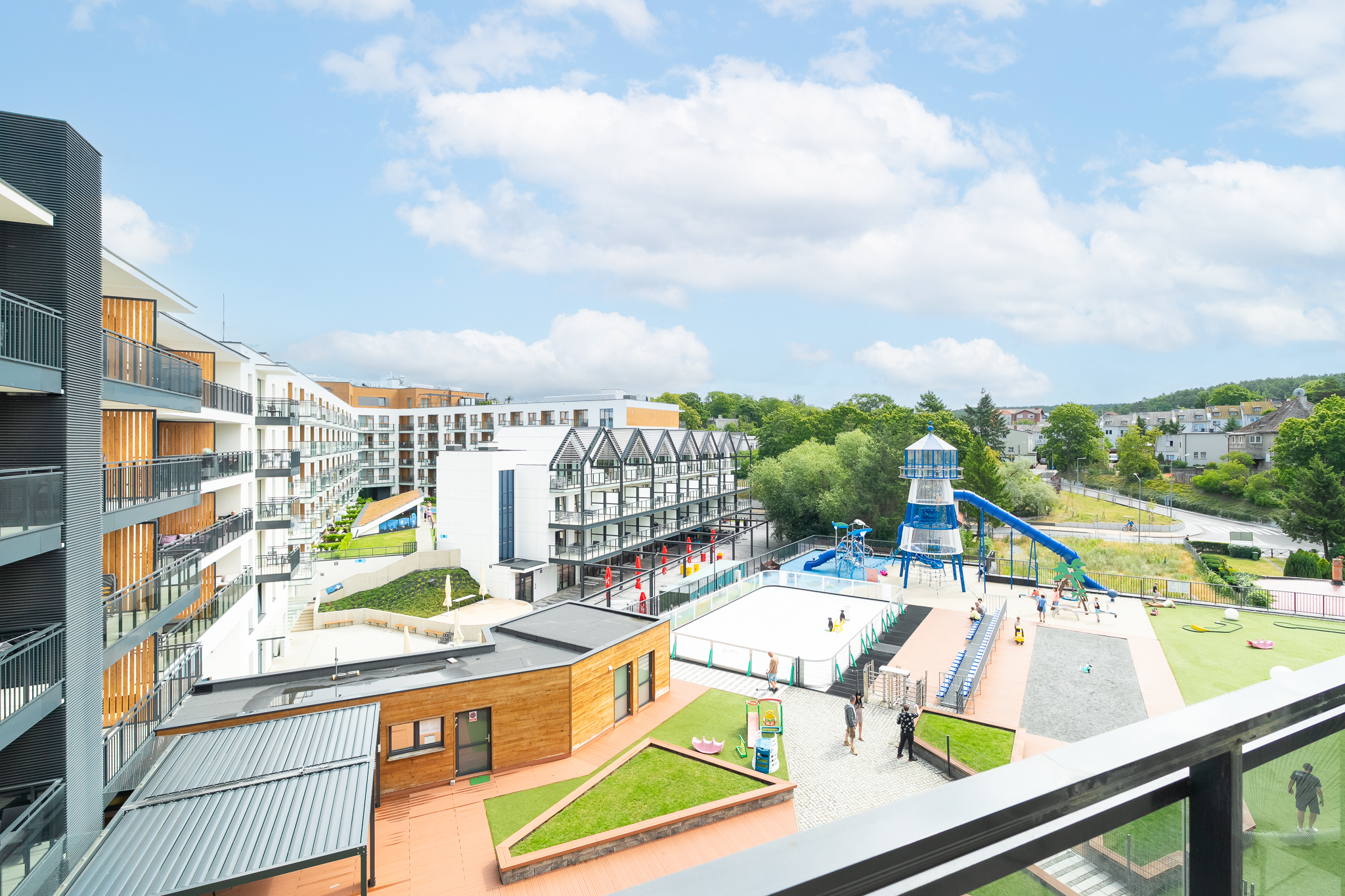 Całoroczne lodowisko, plac zabaw, konstrukcje wspinaczkowe.