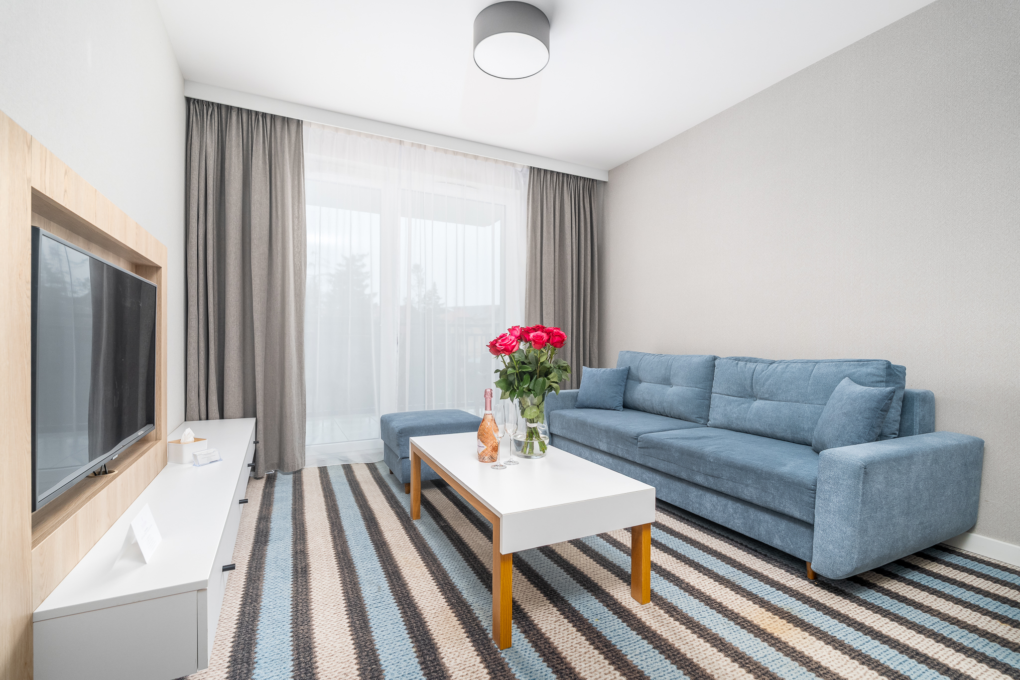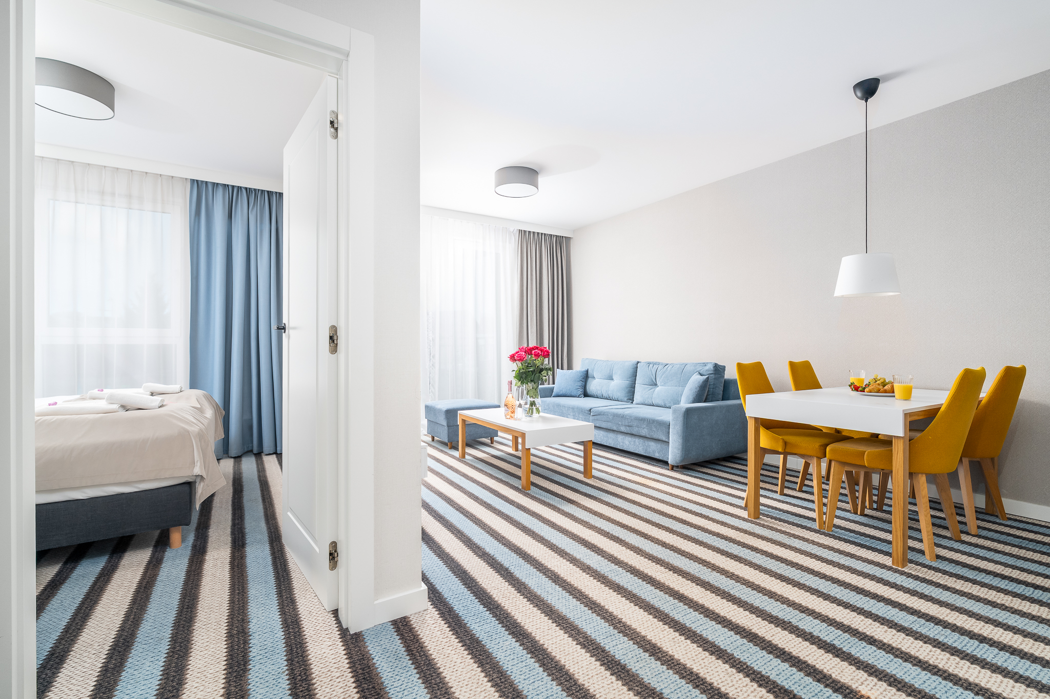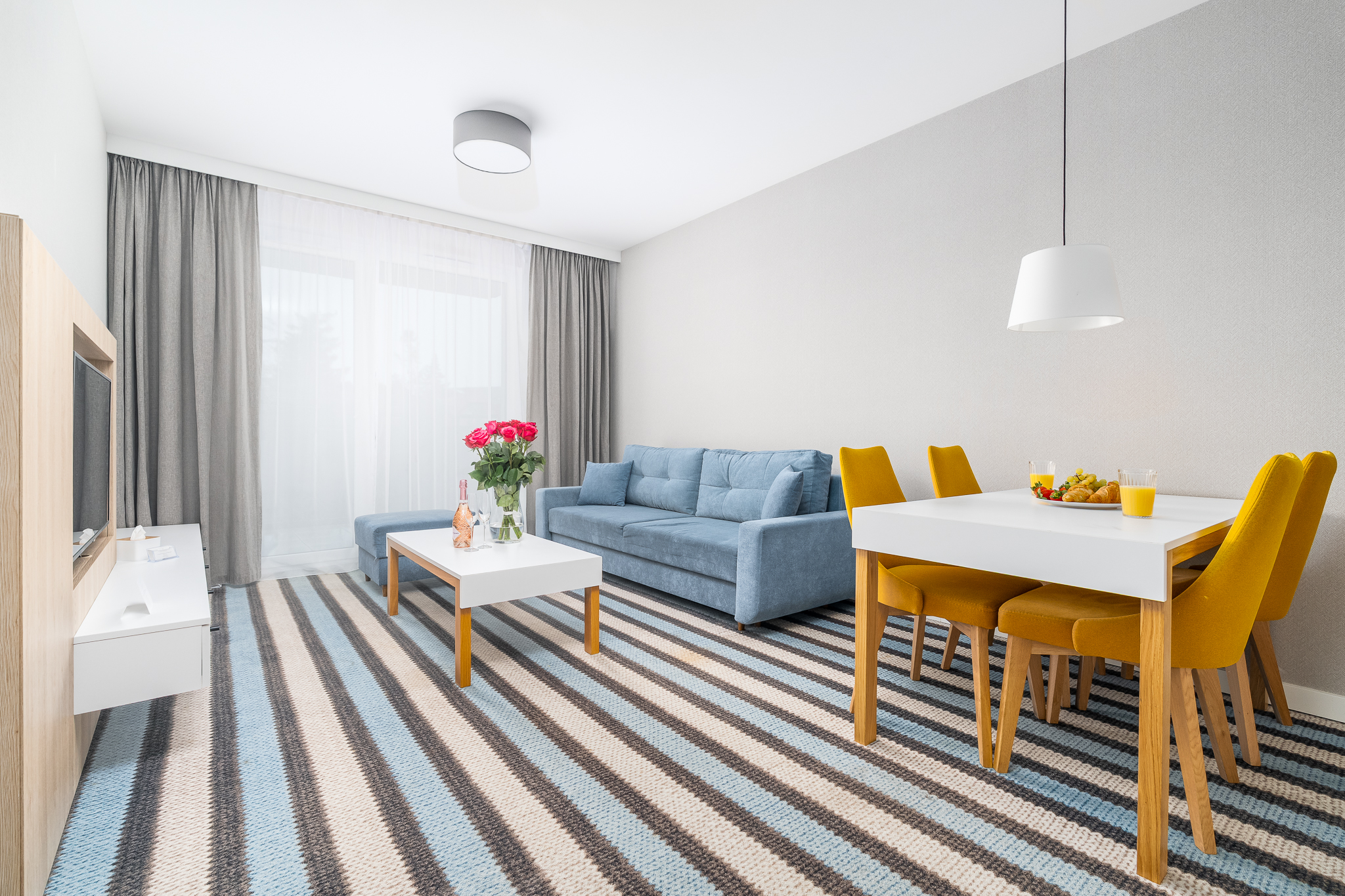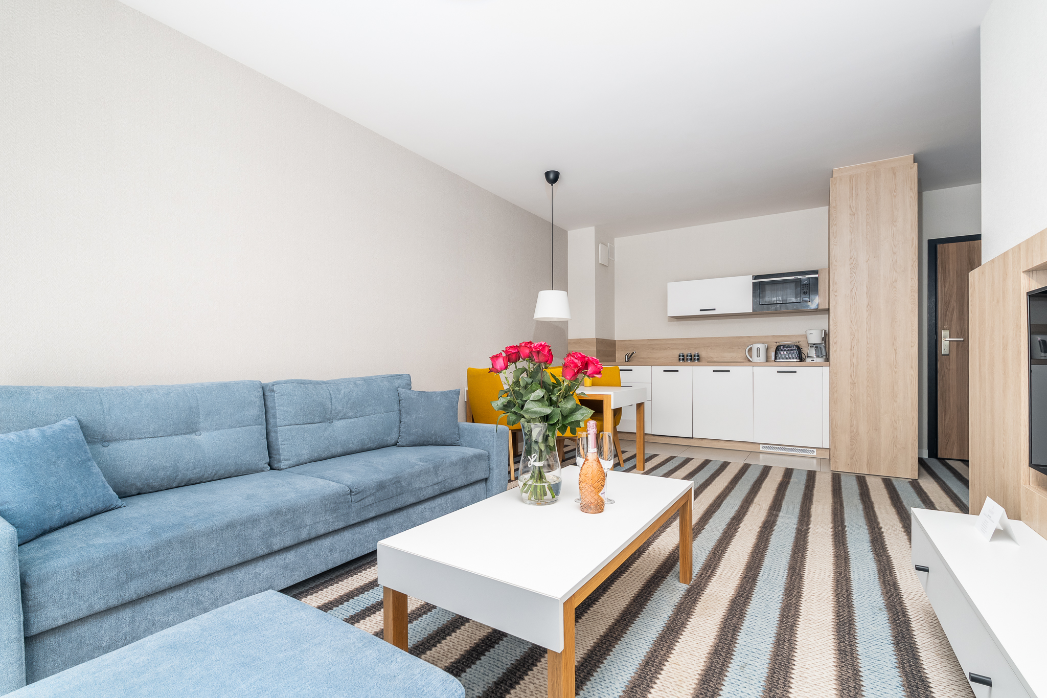 Apartament składa się z przestronnego salonu, w którym znajduje się wygodna rozkładana sofa idealna do odpoczynku i relaksu po dniu pełnym atrakcji. Salon jest połączony z nowoczesnym aneksem kuchennym, wyposażonym we wszystkie niezbędne sprzęty, co umożliwia przygotowanie własnych posiłków w miłej atmosferze.