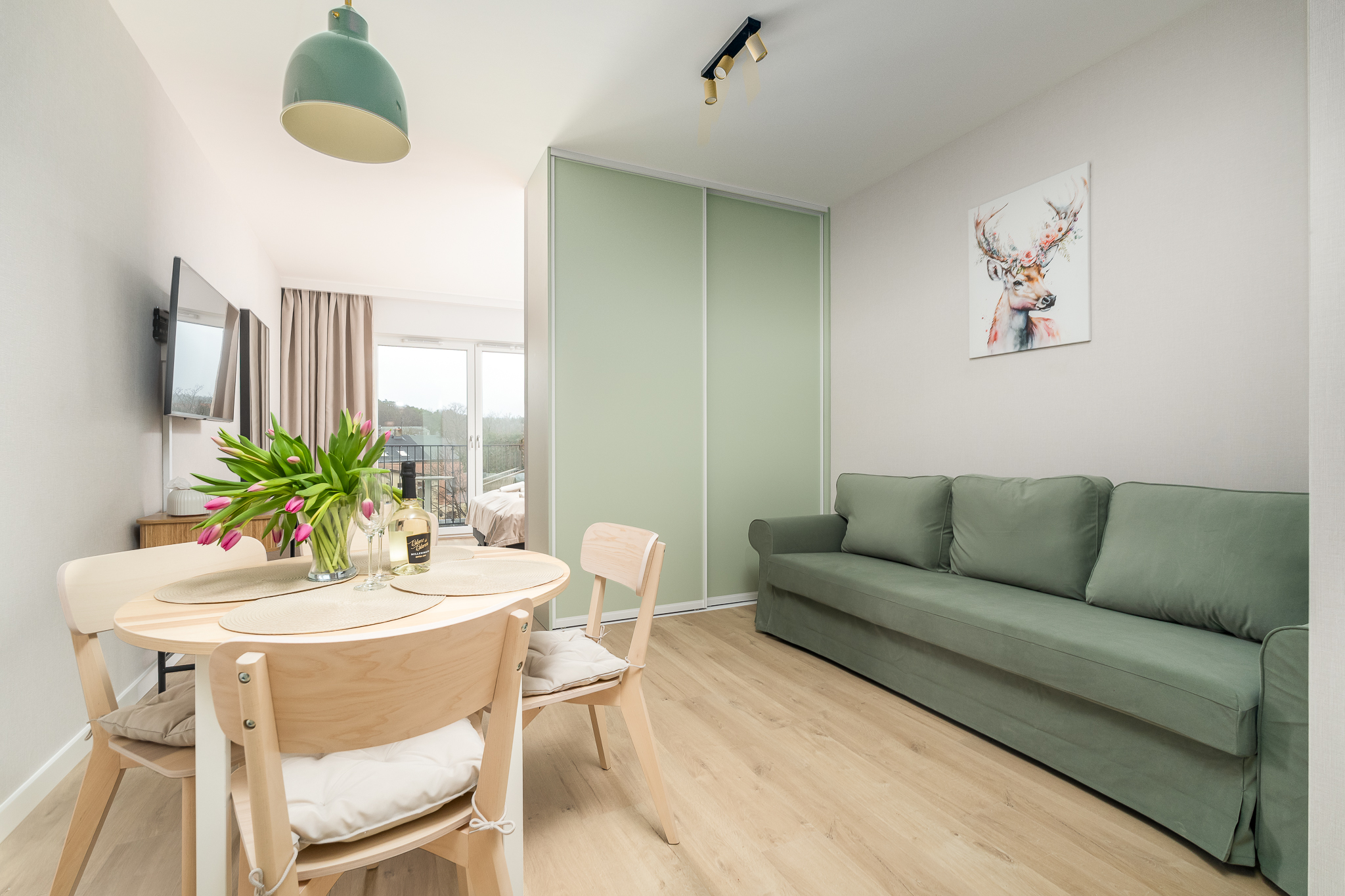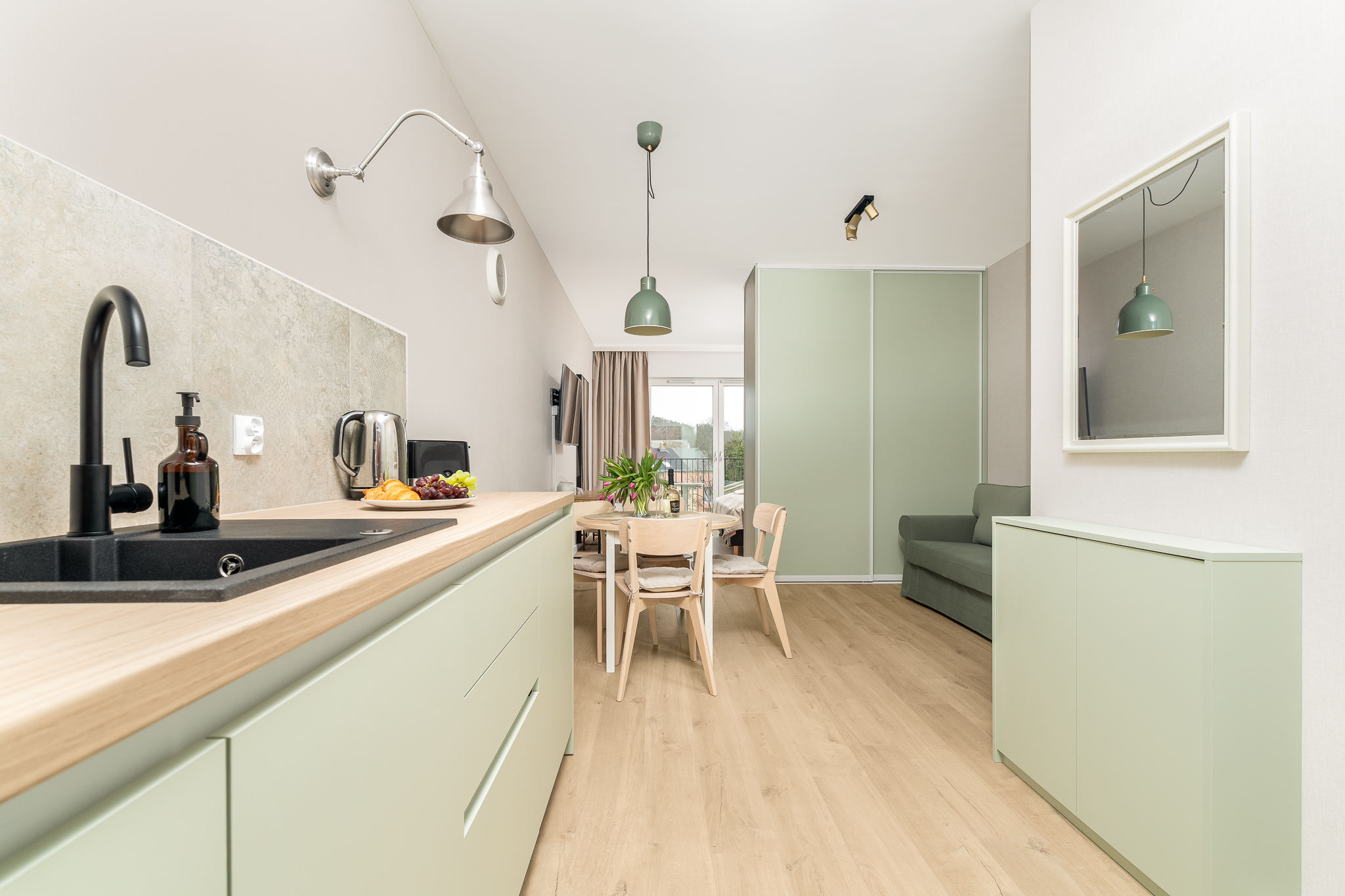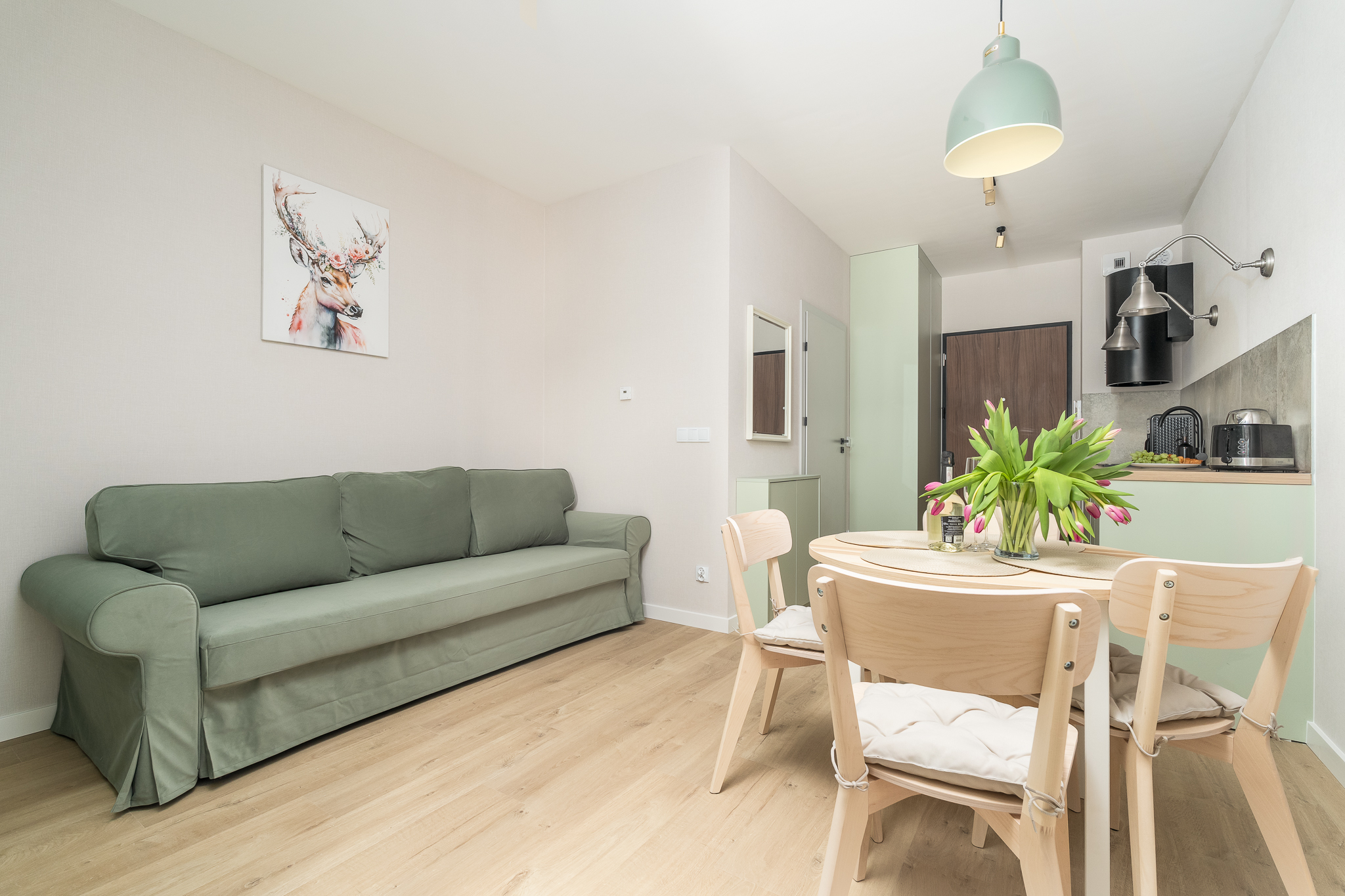 Apartament składa się z przestronnego salonu, w którym znajduje się wygodna rozkładana sofa, idealna do odpoczynku i relaksu po dniu pełnym atrakcji. Salon jest połączony z nowoczesnym aneksem kuchennym, wyposażonym we wszystkie niezbędne sprzęty, co umożliwia przygotowanie własnych posiłków w miłej atmosferze.