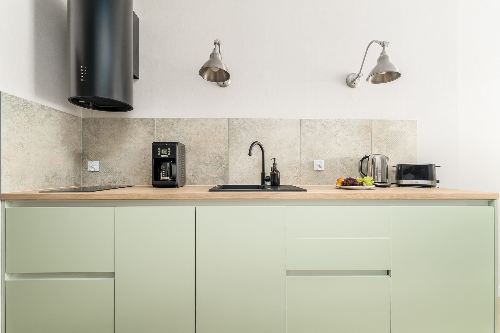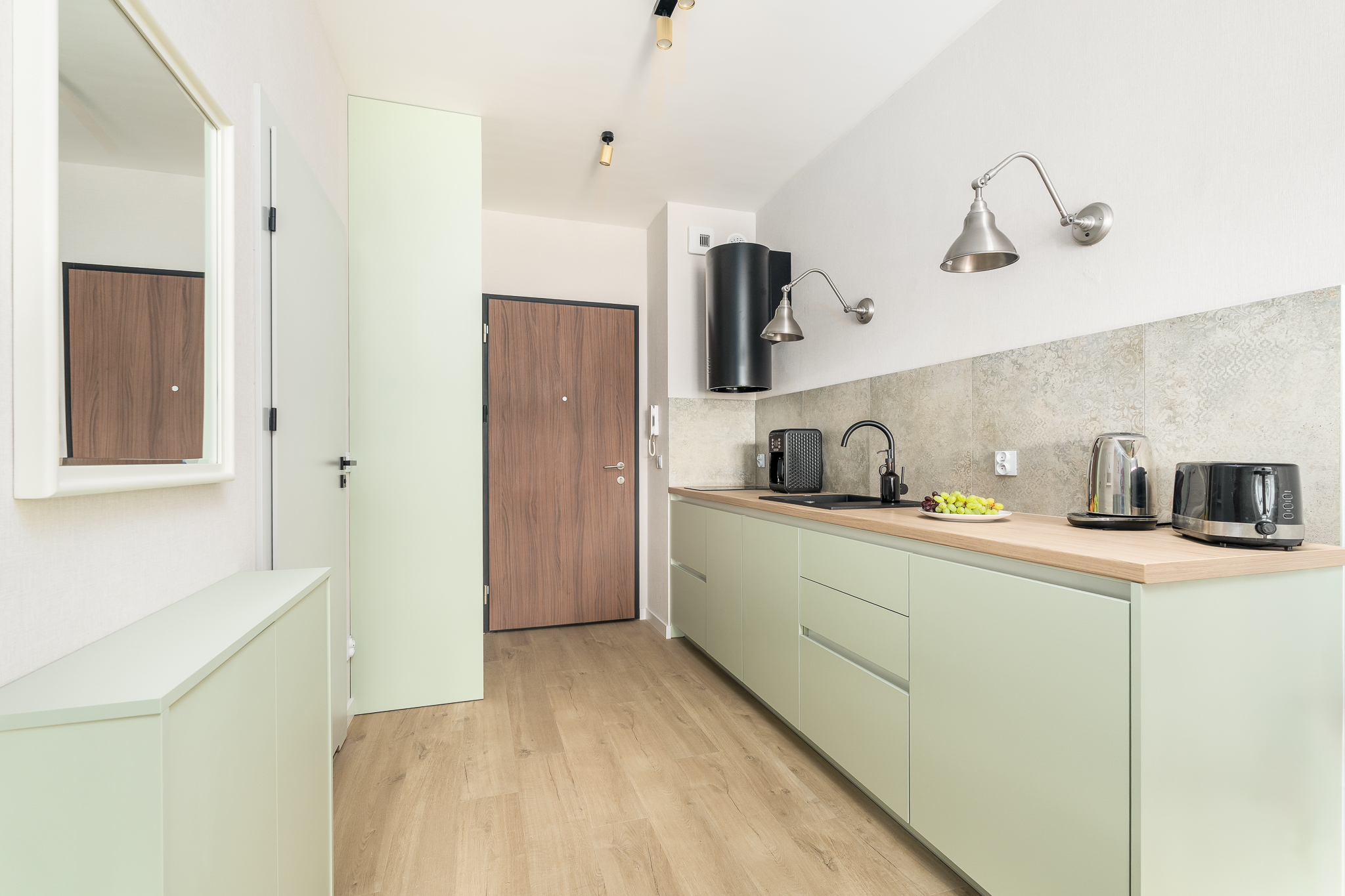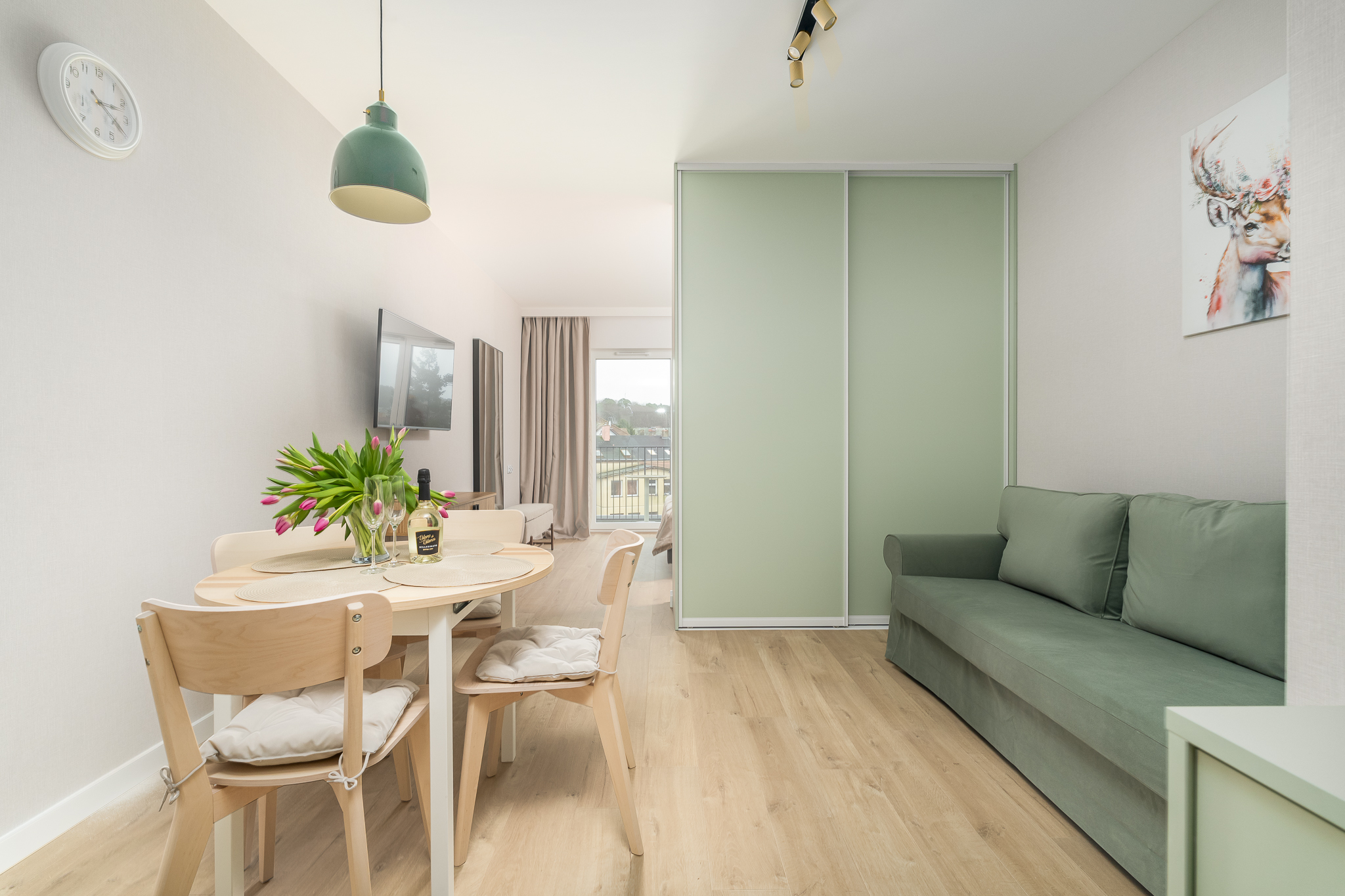 Apartament składa się z przestronnego salonu, w którym znajduje się wygodna rozkładana sofa, idealna do odpoczynku i relaksu po dniu pełnym atrakcji. Salon jest połączony z nowoczesnym aneksem kuchennym, wyposażonym we wszystkie niezbędne sprzęty, co umożliwia przygotowanie własnych posiłków w miłej atmosferze.