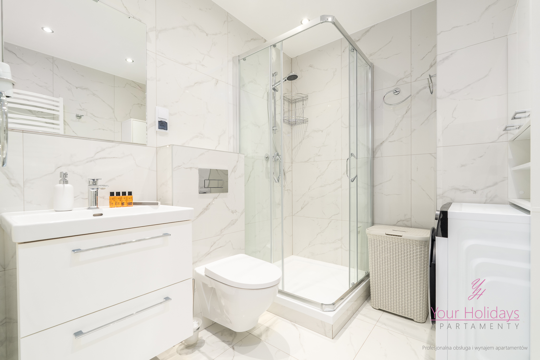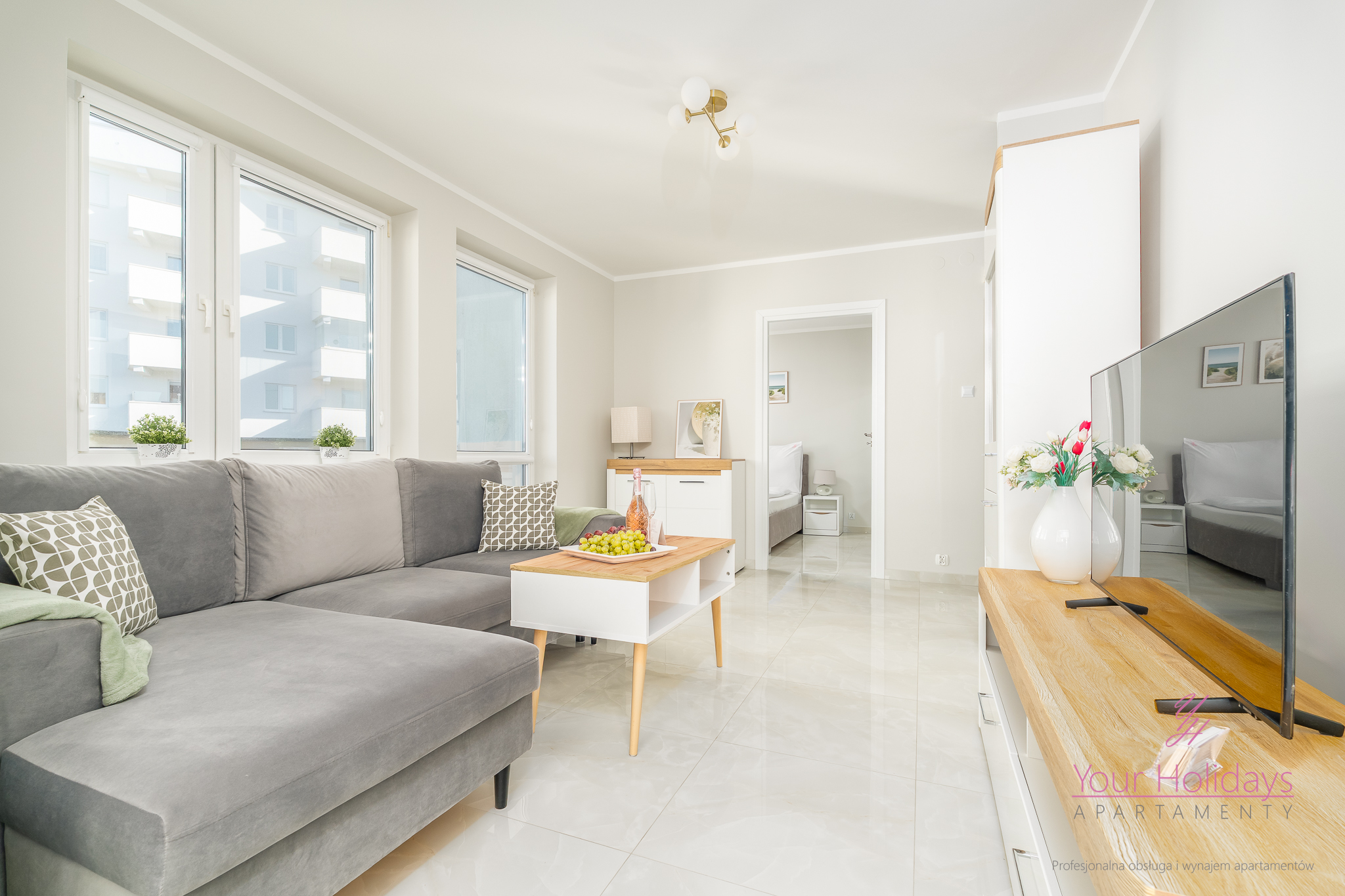 Składa się z przestronnego salonu, w którym znajduje się wygodna rozkładana sofa, połączona z eleganckim aneksem kuchennym. Dodatkowo, apartament posiada sypialnię, w której znajduje się duże łóżko o wymiarach 160×200 cm oraz obszerna szafa. Łazienka z prysznicem została wyposażona w pralkę automatyczną, co dodatkowo podnosi komfort użytkowania.