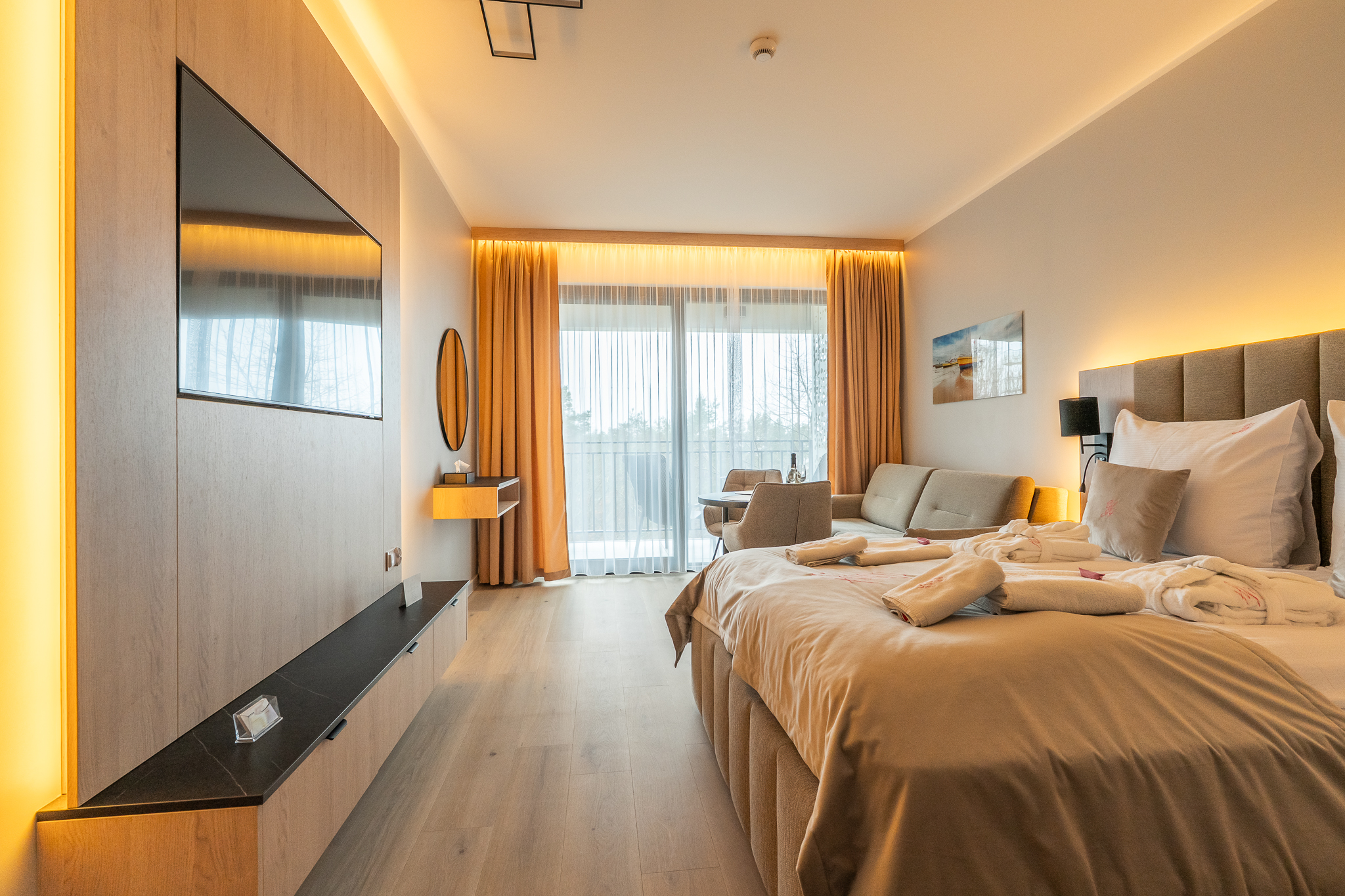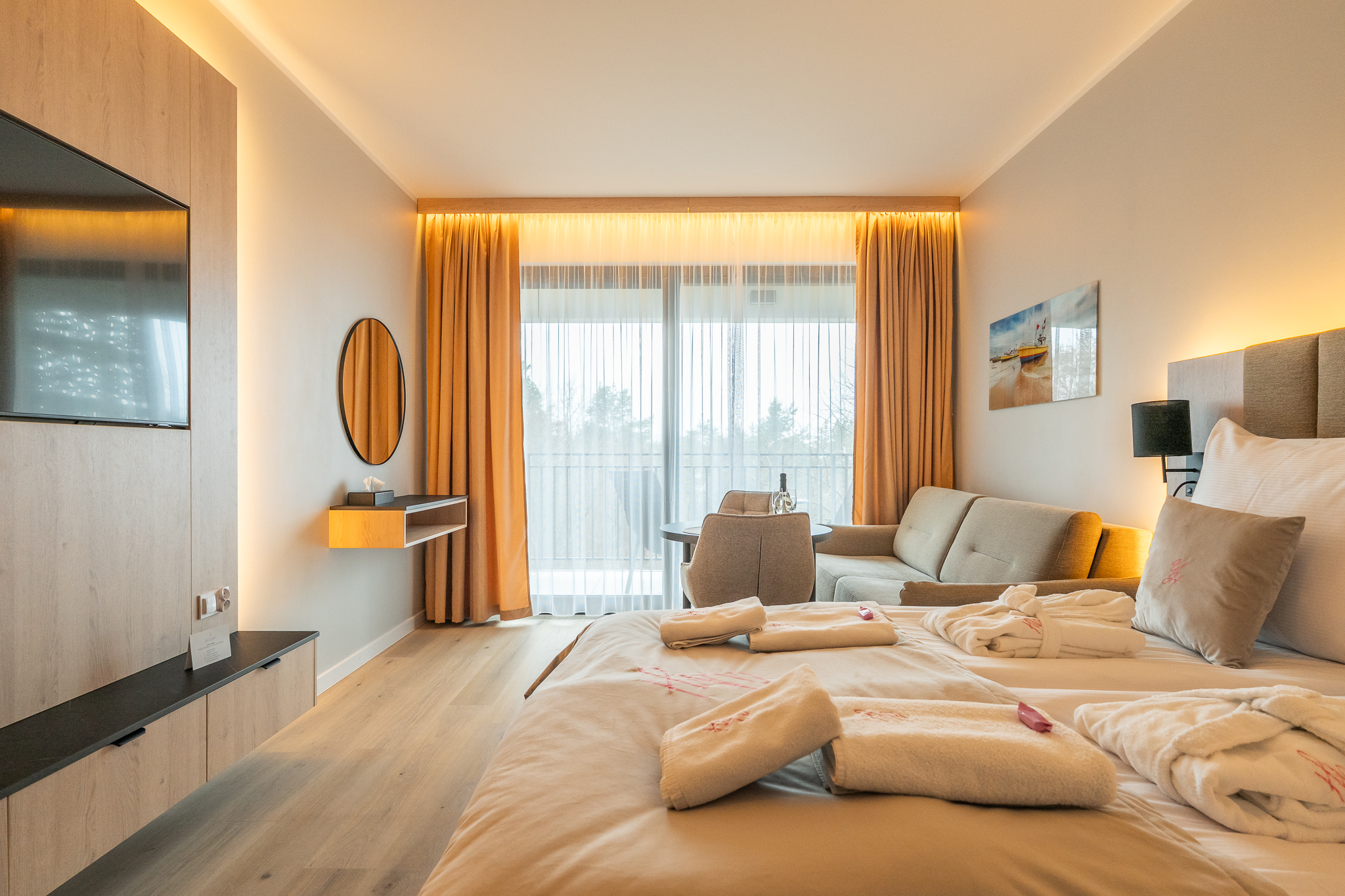 Wnętrze apartamentu składa się z przestronnego pokoju, gdzie znajduje się wygodne łóżko (180×200 cm), sofa z funkcją spania oraz duża szafa. Łazienka wyposażona w pralkę automatyczną i prysznic zapewnia komfortowe warunki pobytu. Bliskość plaży i restauracji sprawia, że każdy dzień można zakończyć smacznym posiłkiem w towarzystwie morza.