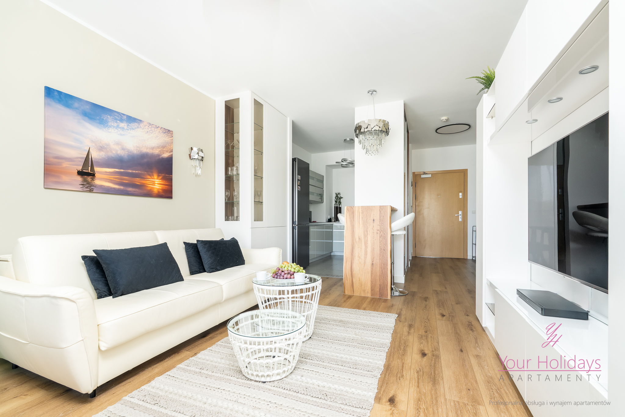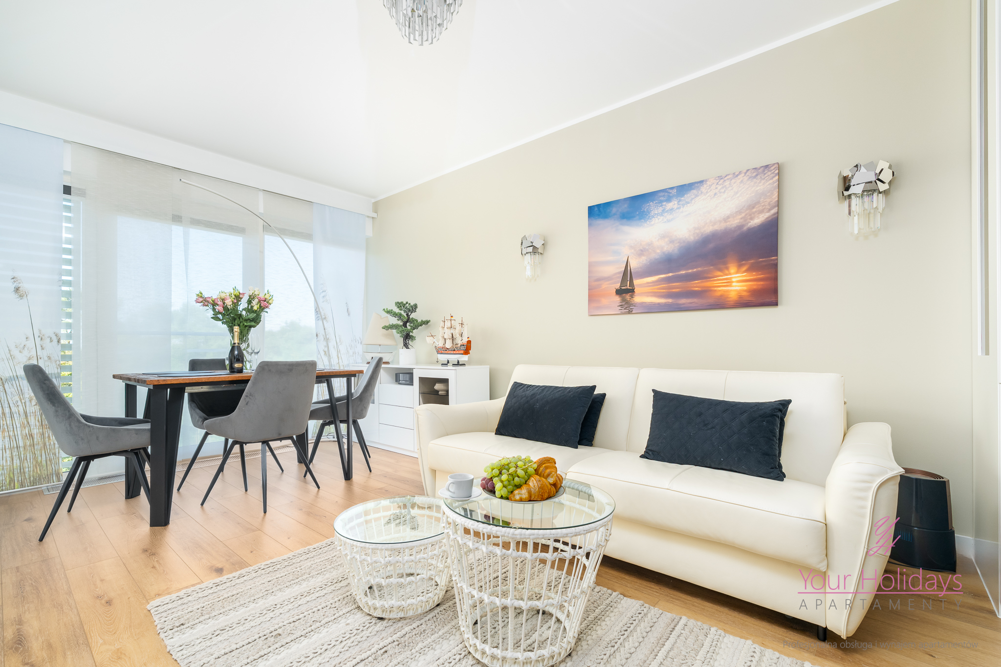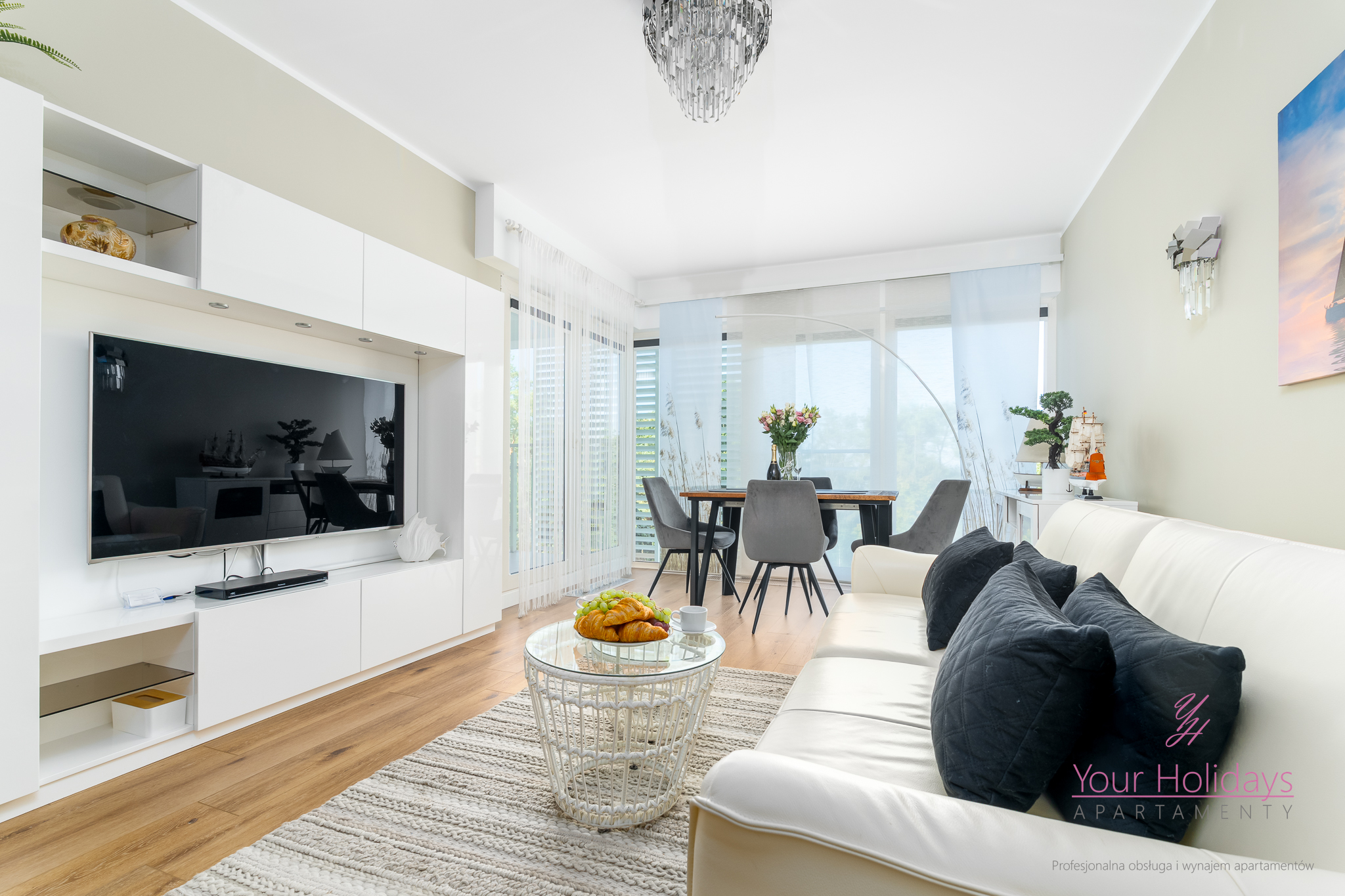 Apartament o powierzchni 58 m2 plus przestronny balkon 6 m2 składa się z eleganckiego salonu z rozkładaną sofą połączonym z aneksem kuchennym, przytulnej sypialni wyposażonej w telewizor, wygodnym łóżkiem (180×200 cm), dużą szafą oraz nowoczesną łazienką z prysznicem z hydromasażem.