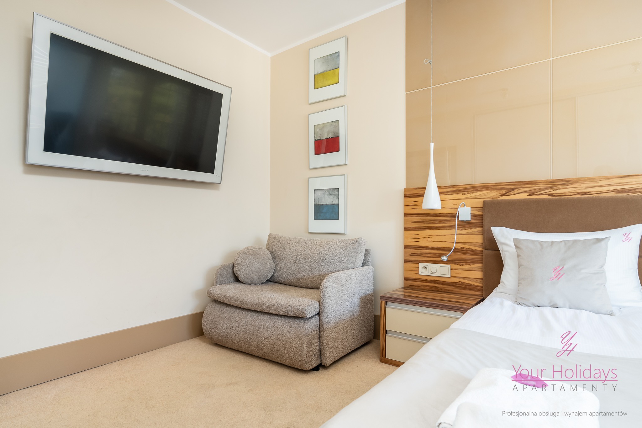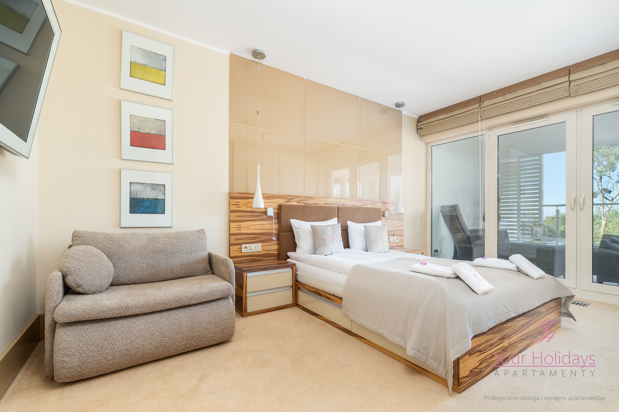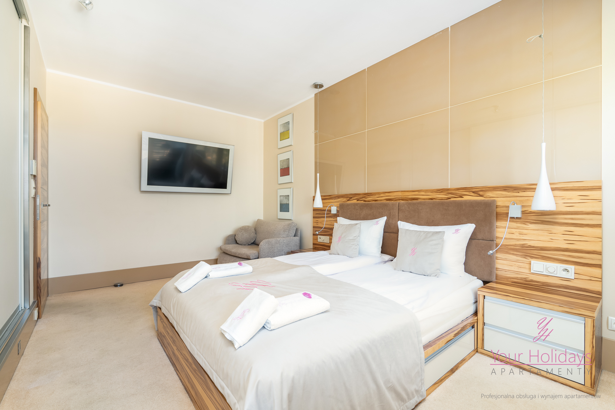 Apartament o powierzchni 55 m2 plus przestronny balkon składa się z eleganckiego salonu z rozkładaną sofą połączonym z aneksem kuchennym, przytulnej sypialni wyposażonej w telewizor, wygodnym łóżkiem (160×200 cm), dużą szafą oraz nowoczesną łazienką z prysznicem.