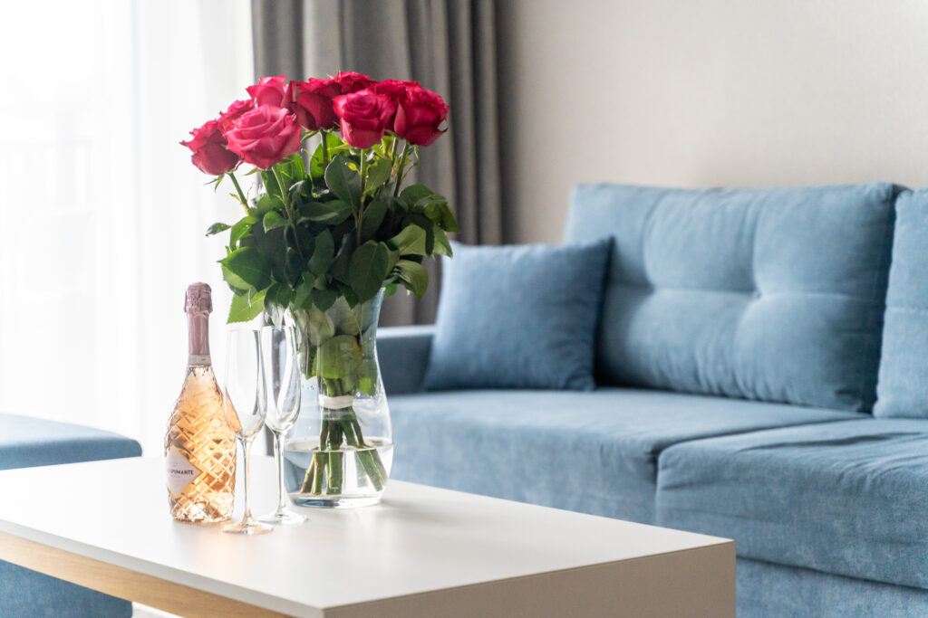 romantyczny wystrój apartamentu (płatki róż, dekoracje)